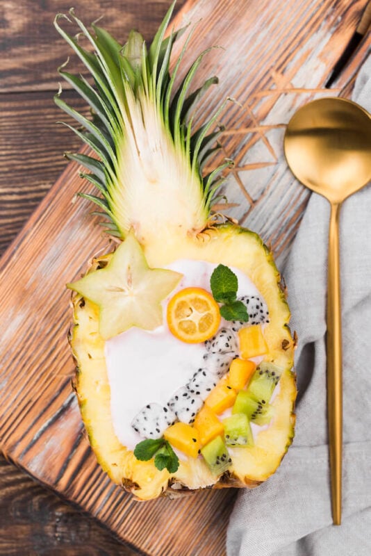 Wydrążone połówki ananasa możesz uprzednio ugrillować (nawet lekko) lub podać jako talerz na surowo. Zarówno świetnie sprawdzi się w daniach wytrwanych – w połączeniu z owocami morza czy rybami – idealnie komponuje się w z ryżem i cytrusowymi akcentami, ale również jako deser, np. naczynie na lody, mus czy po prostu jako salaterka na sałatkę owocową. Nie tylko dzieciaki w ten sposób są zachęcone do jedzenia 😉