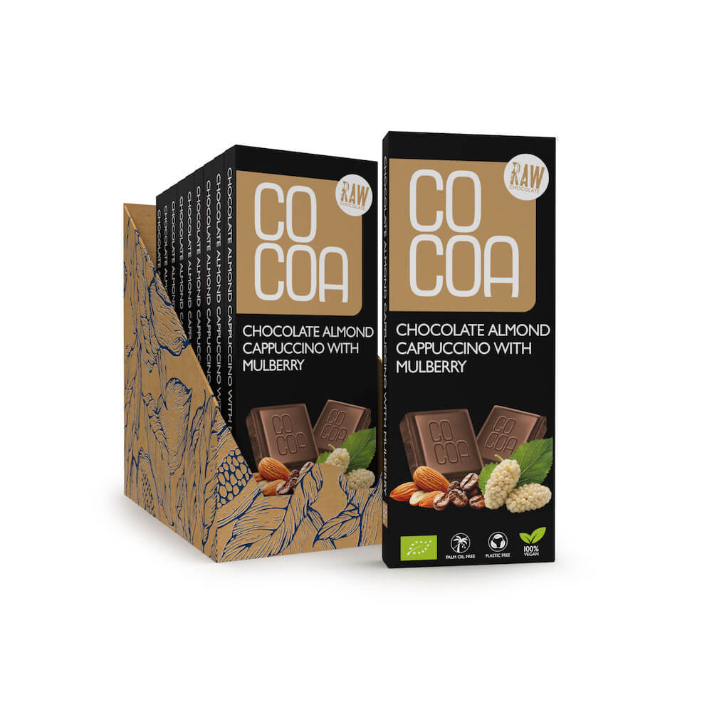 Intrygujące połączenie naszej surowej czekolady w wersji migdałowego cappuccino z dodatkiem morwy. Kremowe oraz delikatne połączenie składników to propozycja dla fanów subtelnych smaków, gdzie gorycz czekolady nie dominuje.
