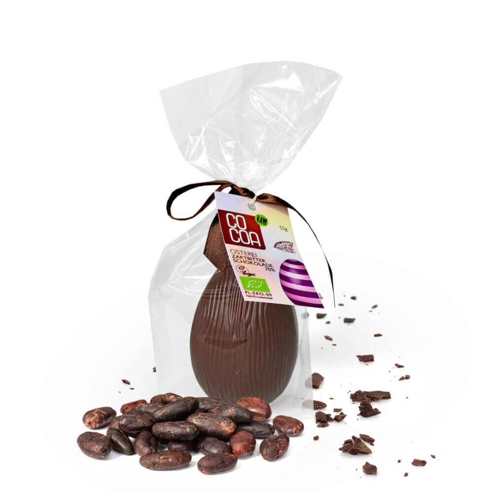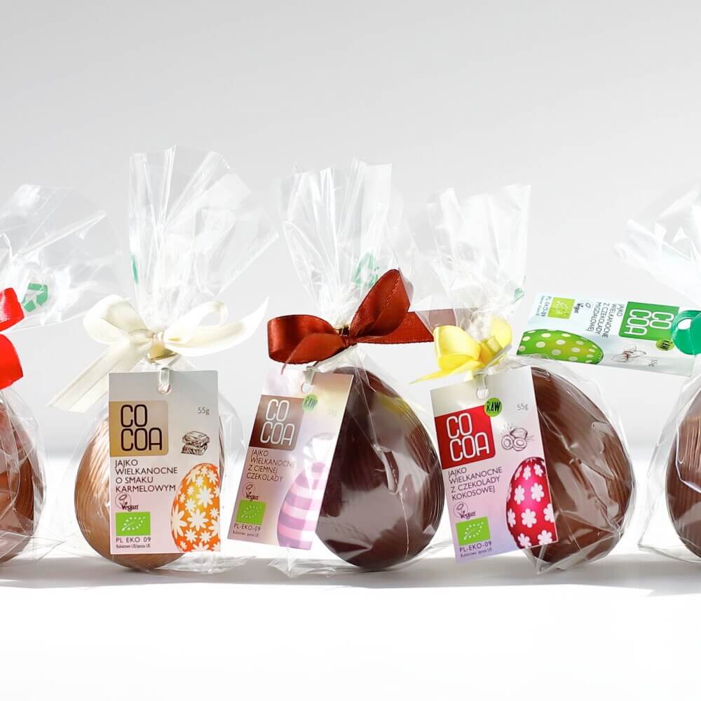 Czekoladowe jajka już od wielu lat towarzyszą nam podczas świąt wielkanocnych. Producenci prześcigają się w dostarczaniu coraz nowszych smaków. My proponujemy jako z ciemnej wegańskiej czekolady z zawartością 70% kakao. Oprócz wyjątkowego smaku gwarantujemy też skład pozbawiony sztucznych słodzików, laktozy i glutenu. Sprawdź nasze czekoladowe jajko wielkanocne z wegańskiej czekolady!