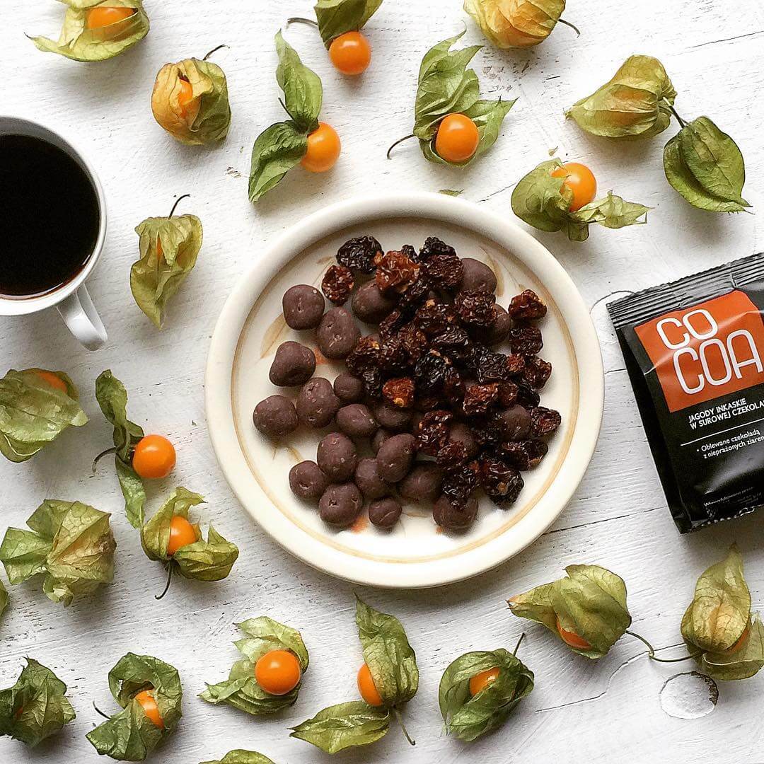 Jagody Inkaskie znane są z bardzo wytrawnego smaku. Charakterystycznych, kwaśno-słodkich akcentów nie zdominuje nawet ciemna, intensywna czekolada. Chociaż w tej kombinacji wyczuwalne są smaki czekoladowe, to akcenty winne z jagód Inków wydają się najbardziej charakterystyczne dla całego produktu. Propozycja dla tych, którzy lubią ciemną czekoladę, ale z bardzo intensywną nutą owocową.Produkt w 100% wegański.