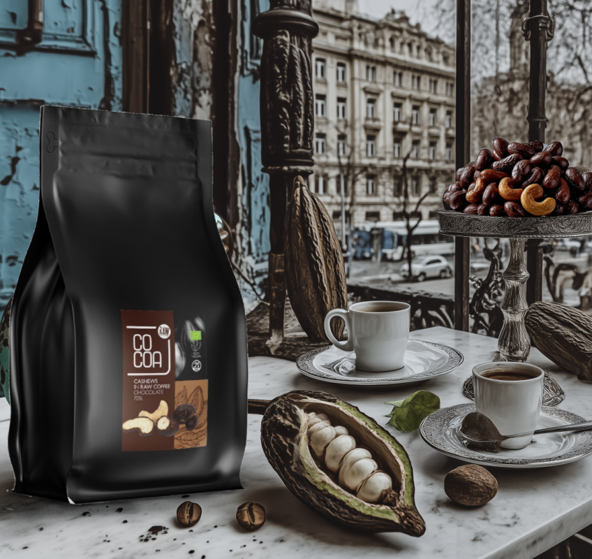 Nasza autorska surowa czekolada to prawdziwa gratka dla miłośników czekolad! Jest subtelna w smaku i pozbawiona mocnej goryczy. Surowa czekolada zapewnia nam intensywny smak ziaren peruwiańskiego kakaowca, które świetnie komponują się z chrupkością nerkowców oraz z nutą kawy. Gwarantujemy, że ta kombinacja zaskoczyła pozytywnie już niejednego smakosza słodkich przekąsek!